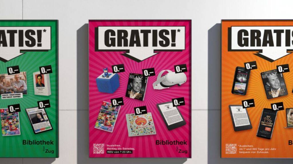 Die Bibliothek Zug wirbt für ihr kostenloses Bildungs- und Freizeitangebot.