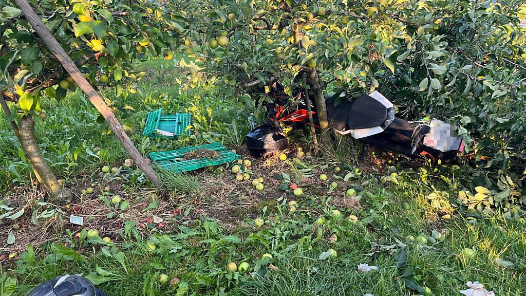 Der Töff mit den beiden jungen Männern überquerte die Gegenfahrbahn und kam in einer Obstanlage zum Stillstand. Die Polizei sprach in ihrer Mitteilung von leichten bis mittelschweren Verletzungen bei Fahrer und Sozius. Der Sachschaden beträgt mehrere tausend Franken.