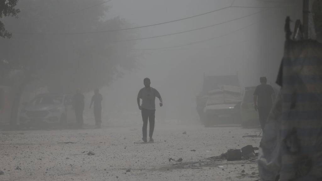 ARCHIV - Palästinenser laufen durch Staub nach einem israelischen Militärschlag (Archivbild). Foto: Yousef Al Zanoun/AP/dpa