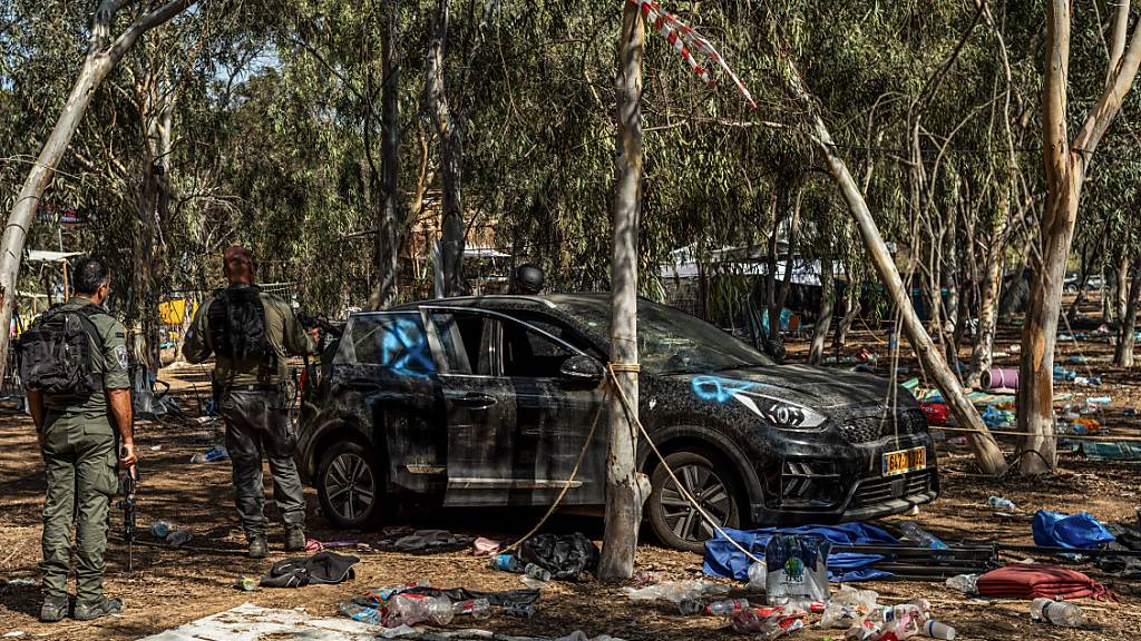 Israelische Soldaten stehen neben einem verlassenen Auto auf dem Gelände des Supernova-Wüstenmusikfestivals. Angreifer der im Gazastreifen herrschenden Islamistenorganisation Hamas hatten Hunderte Menschen auf dem Festival getötet und viele weitere als Geiseln verschleppt. Foto: Ilia Yefimovich/dpa