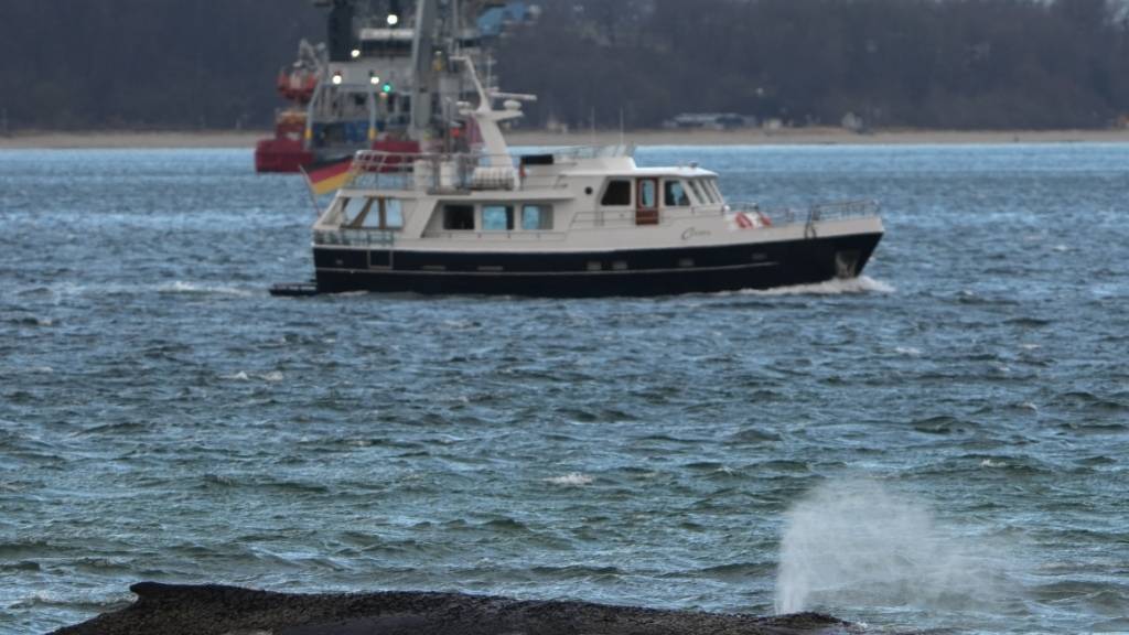 Etwa hundert Meter vor der Seebrücke, neben der der Wal gestrandet ist, stehen Absperrungen und Polizei. Auf der Ostsee zeigen sich am Mittwoch weisse Schaumkronen. Es ist stürmisch, eiskalt und regnerisch - vermutlich deshalb sind nur wenige Schaulustige hinter den Absperrungen zu sehen.