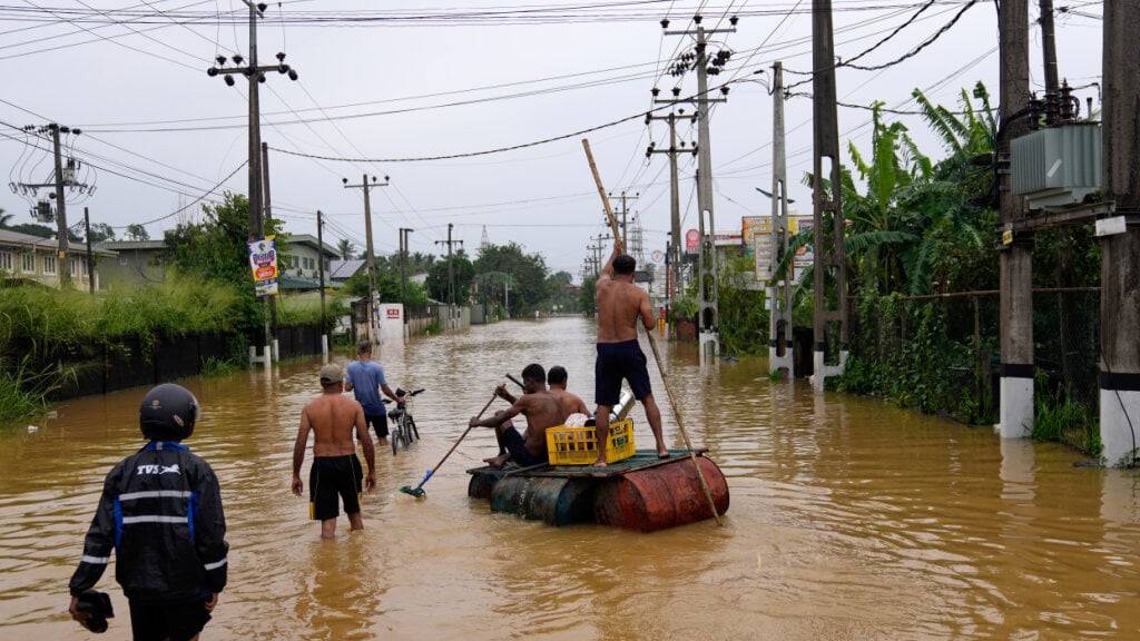 Menschen benutzen ein provisorisches Floß, um auf einer überfluteten Straße zu fahren. Foto: Eranga Jayawardena/AP/dpa