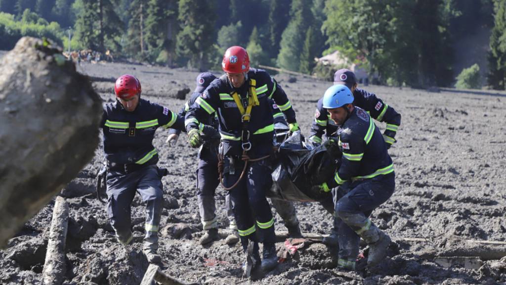 Auf Fotos und Videos in sozialen Netzwerken war zu sehen, wie eine Hotelanlage zu grossen Teilen von Erd- und Schlammmassen bedeckt ist. Der Erdrutsch geschah den georgischen Angaben zufolge, nachdem am Donnerstagabend ein nahe gelegener Fluss über die Ufer getreten war. Mehr als 400 Rettungskräfte sind demnach im Einsatz.