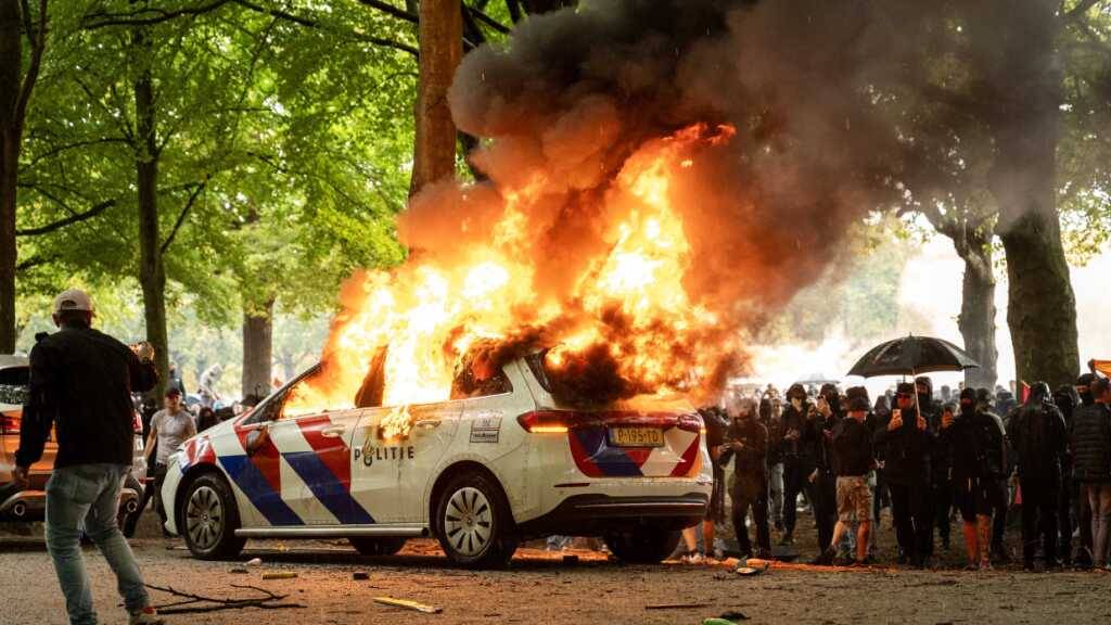 Ein Polizeiauto sei in Brand gesetzt worden. Die Sicherheitskräfte hätten daraufhin Wasserwerfer gegen die Randalierer gerichtet. Etliche seien festgenommen worden. Nach Angaben des Senders NOS schwenkten einige Demonstranten orange-weiss-blaue sogenannte Prinzenflaggen, die einst der National-Sozialistischen Bewegung (NSB) der Niederlande als Symbol dienten und heute von Rechtsextremisten verwendet werden.