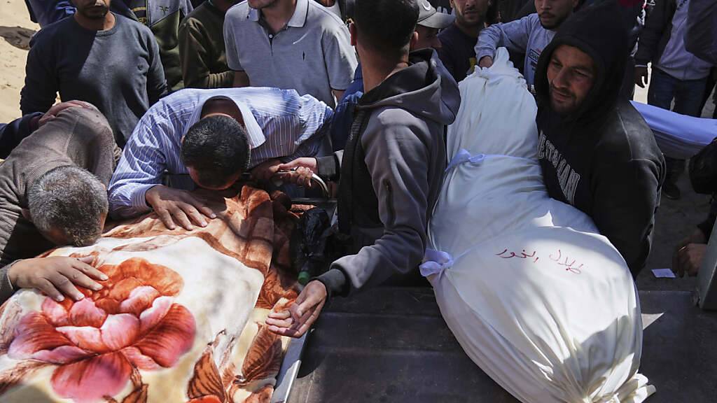 Palästinenser trauern über den Leichen ihrer Verwandten, die bei einem israelischen Luftangriff getötet wurden. Foto: Jehad Alshrafi/AP/dpa