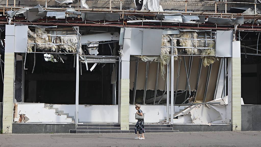 ARCHIV - Eine Frau geht an einem durch russischen Beschuss zerstörten Gebäude nahe der Frontlinie in der Ostukraine vorbei. Foto: -/Ukrinform/dpa