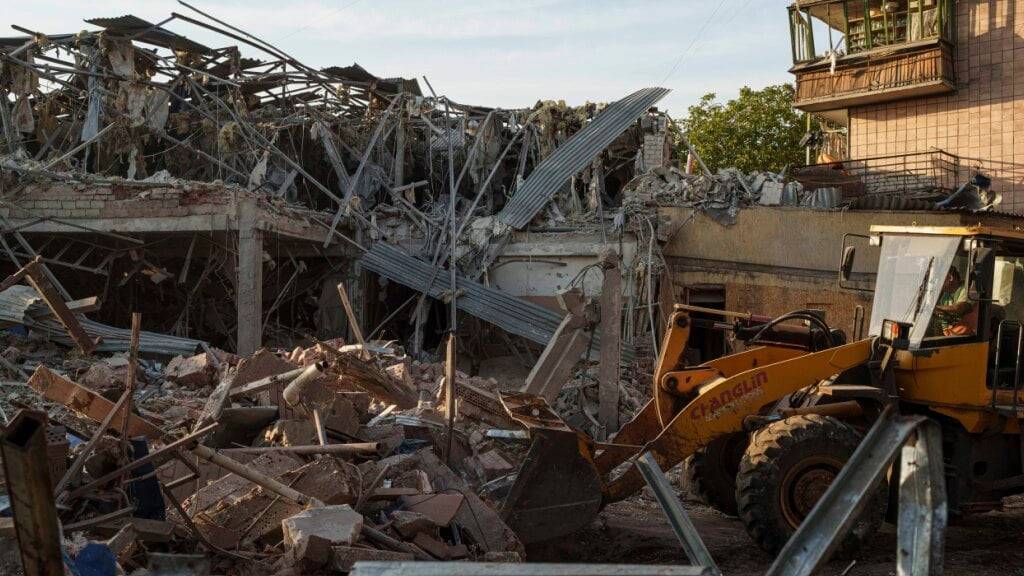 ARCHIV - Ein Traktor beseitigt die Trümmer nach einem russischen Angriff auf das Hotel Sapphire. Foto: Evgeniy Maloletka/AP/dpa