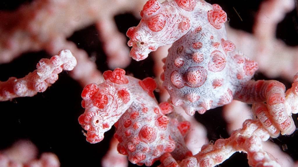 Mit einer Grösse von etwa zwei Zentimetern zählen Zwerg-Seepferdchen - auch Pygmäenseepferdchen genannt - zu den kleinsten Wirbeltieren weltweit. Und man muss schon sehr genau hinblicken, um die winzigen Tierchen in ihrem natürlichen Lebensraum auszumachen: Denn diese Seepferdchen leben im Verbund mit Gorgonien-Weichkorallen der Gattung Muricella, an denen sie sich mit dem Schwanz festhalten - und denen sie zum Verwechseln ähnlich sehen.