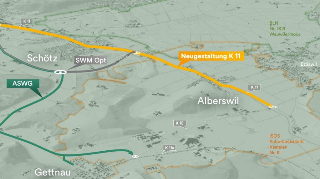 Die Umfahrung «West Alberswil und Schötz bis Gettnau» (ASWG) belegte in der ZMB den zweiten Rang. Sie würde die Dorfzentren vom Schwerverkehr entlasten und die Aufenthaltsqualität erhöhen, bringe laut Kanton jedoch hohe Kosten, mehr Kulturlandverbrauch und höheren Luftschadstoffausstoss mit sich.