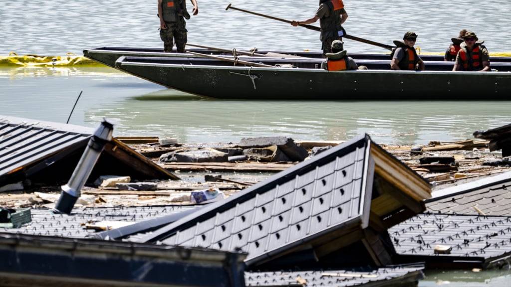 Ein Fotograf von Keystone-SDA konnte am Dienstagnachmittag einen Teil des Katastrophengebiets überfliegen. Er berichtete von der Arbeit der Soldaten in zwei Booten, die Trümmer einsammelten und sie in einem schwimmenden Damm lagerten. In einem zweiten Schritt seien diese mithilfe eines Baggers an das Ufer befördert worden.