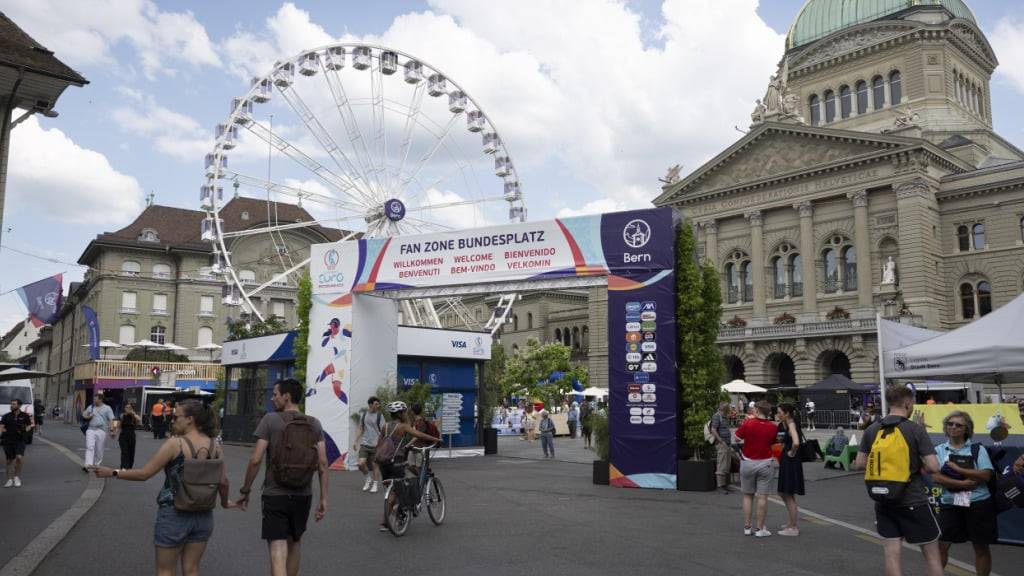 Das temporäre Wahrzeichen von Bern ist ein Riesenrad auf dem Bundesplatz. Es soll die Menschen in die Fanzone vor dem Bundeshaus locken. Bei der Gluthitze vom Dienstagnachmittag waren es zunächst vor allem Kinder, welche die Attraktionen wie einen Mini-Fussballplatz in Beschlag nahmen.