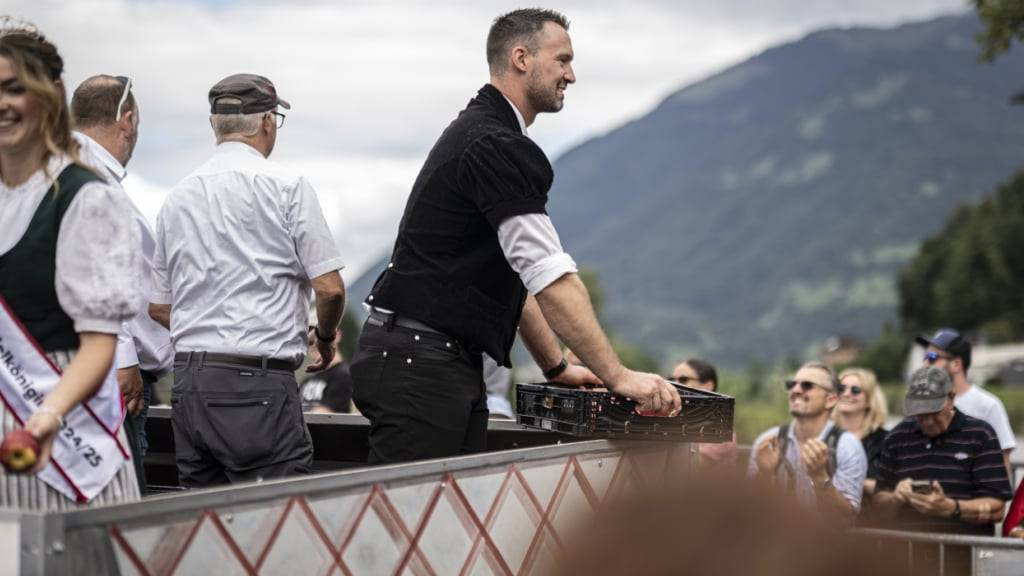 Kilian Wenger verteilt Äpfel an ESAF-Umzug in Mollis GL