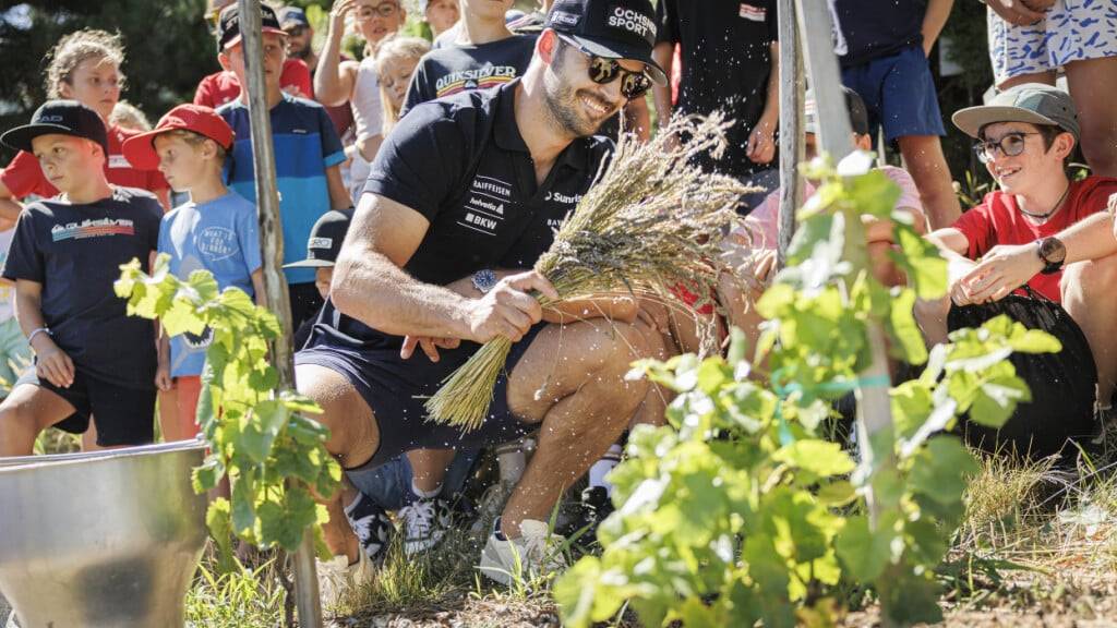 Skistar Loïc Meillard arbeitet im Farinet-Rebberg