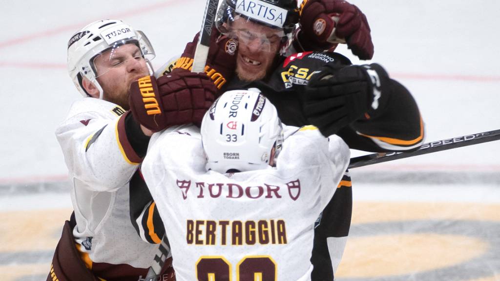 Alessio Bertaggia und Tanner Richard im Gerangel mit Luganos Mico Müller