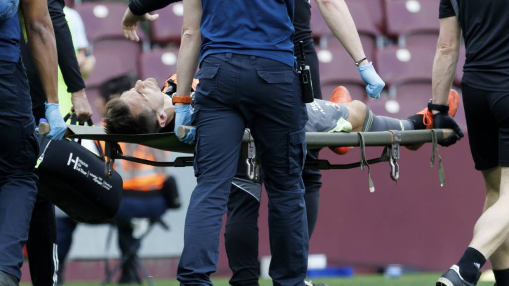 Servettes Goalie Joël Mall wird im Heimspiel gegen Luzern mit der Bahre vom Feld getragen