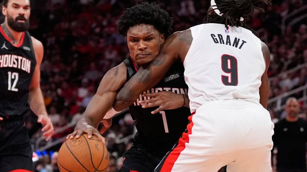 Houstons Amen Thompson (am Ball) kann von Portlands Jerami Grant nur mit einem Foul gestoppt werden