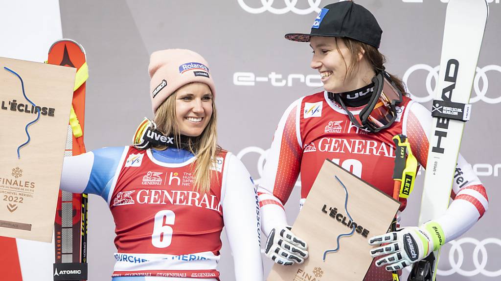 Christine Scheyer (rechts neben der zeitgleichen Joana Hählen) steht im März 2022 in der Abfahrt von Courchevel als Zweite letztmals auf dem Weltcup-Podest