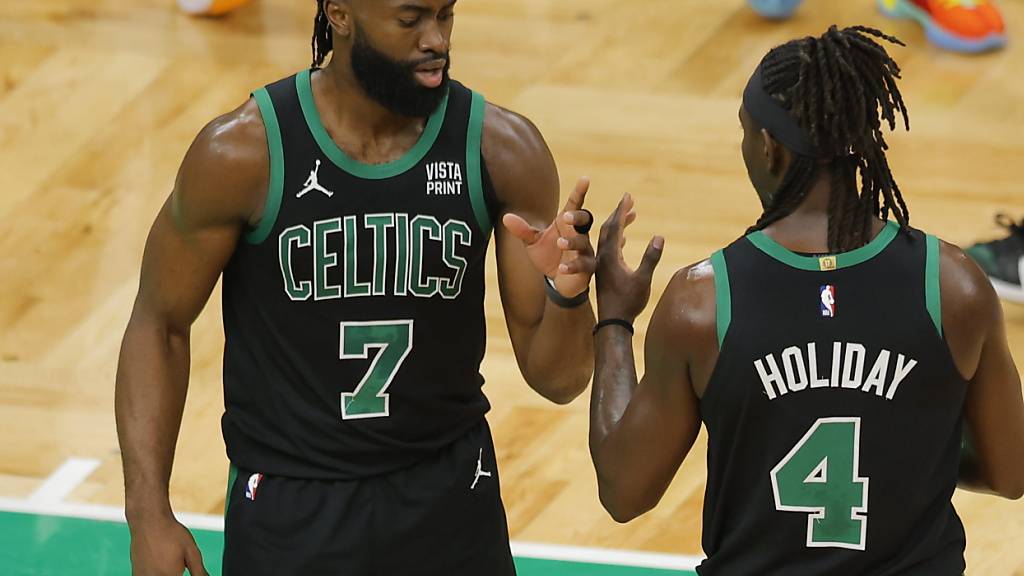 Jaylen Brown von den Boston Celtics (links) feiert mit Teamkollege Jrue Holiday